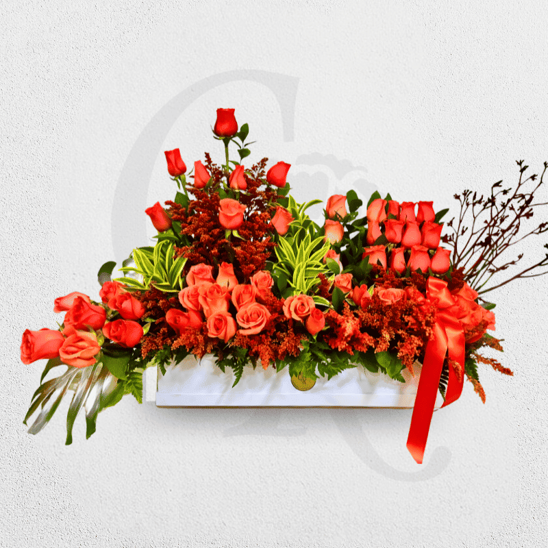 Una línea de rosas que se extiende como un atardecer en flor. Su forma horizontal crea un equilibrio sutil entre caída y elevación, dibujando un horizonte donde la elegancia fluye con naturalidad.