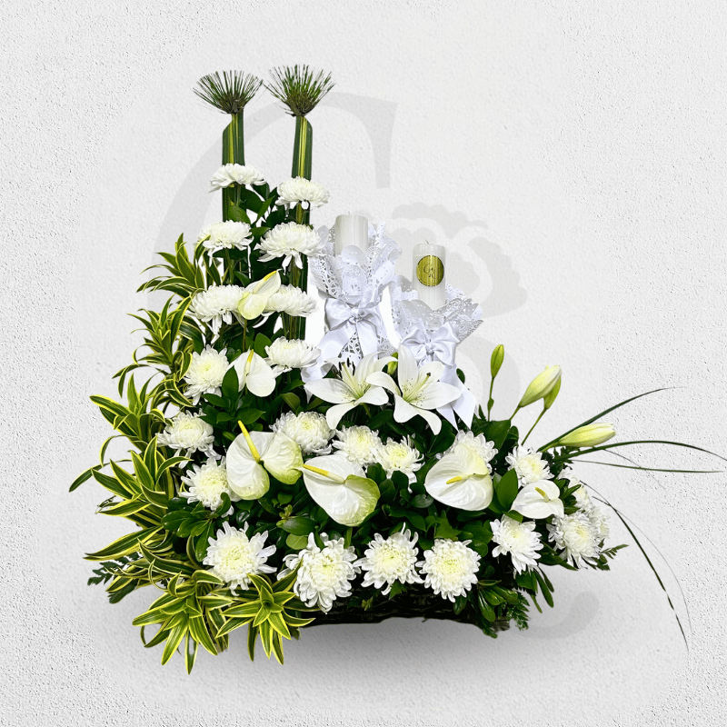 Curva blanca con follajes y cirios. Una pieza que expresa movimiento, vitalidad espiritual y recogimiento.